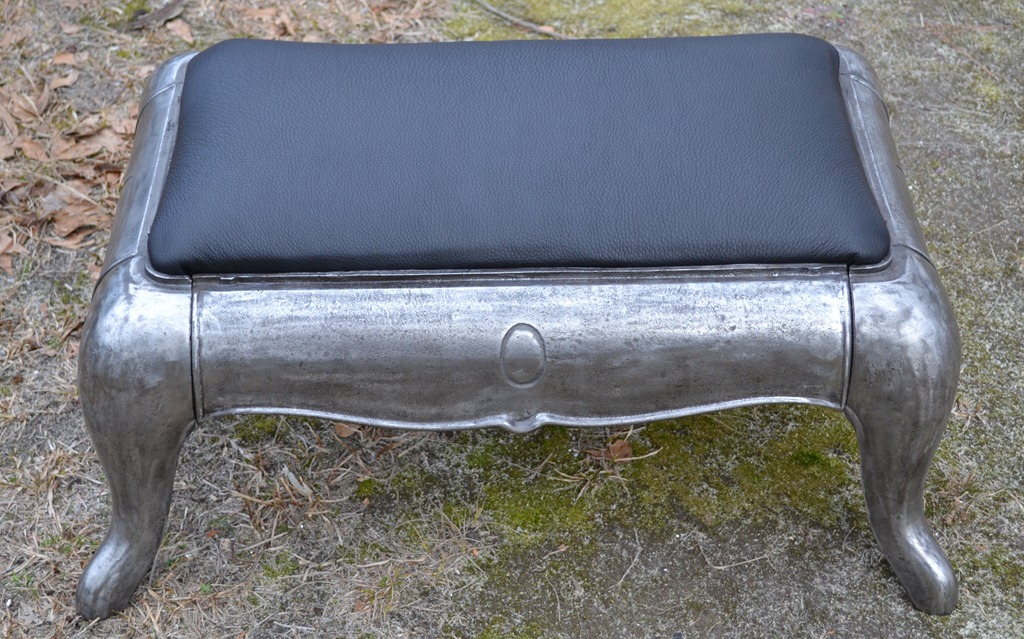 Metal and leather. Different. But definitely compatible. Remember this? This duo of cast iron and cowhide is now an ottoman.
