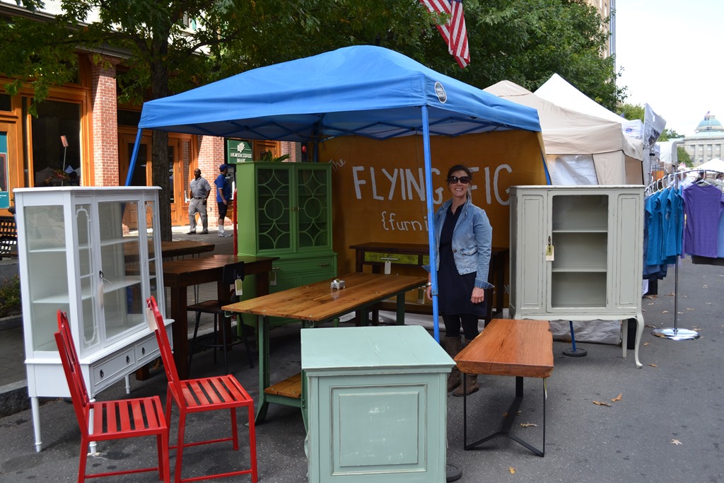 In the shadow of Raleigh’s tallest building, we set up shop at the Wide Open Bluegrass festival. As you can tell from the reflection in the glass façade, the skies were happy ones. The blue and cumuli (don’t think I’ve ever used the plural of cumulus before!) of September skies are one of my very favorite things.