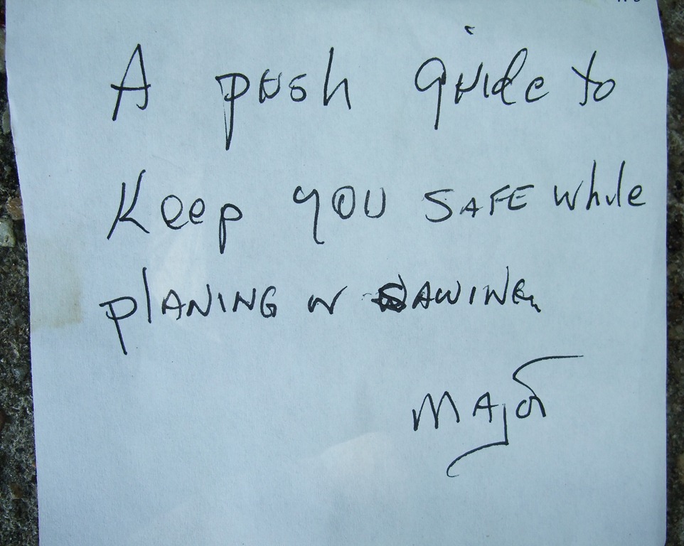 A month ago, we had a visit from a Georgia gent who really knows his woodworking. He shared his expertise and excitement with us…which was a gift within itself. And then later, we received a surprise package in the mail. Inside was a handmade push guide and a scribbled note. Now here’s a guy who knows how to major on the majors.